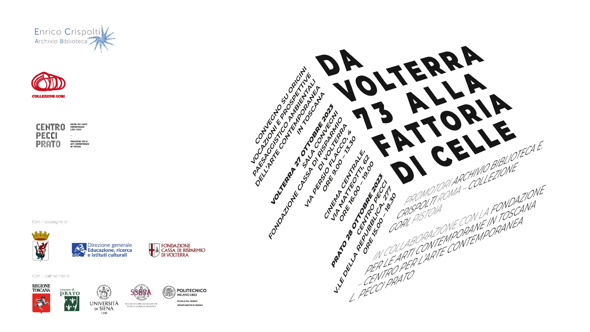 The conference celebrates the 50th anniversary of Volterra 73, an event organized by Enrico Crispolti and Mino Trafeli to promote the participation of the city in the cultural and economic development of its territory, as well as the 40th anniversary of the opening to the public of the Environmental Art Collection established by Giuliano Gori at Fattoria di Celle, in Santomato di Pistoia in 1970.