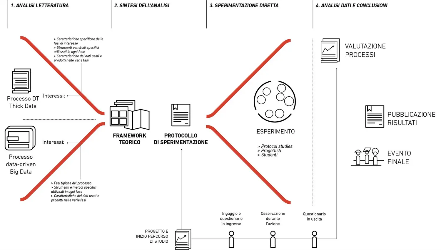 - Mapping of the conceptual landscape, with the aim of synthesising the conceptual model of reference, mapping and cataloguing the characteristics of thick data and big data through literature synthesis and investigation of the characteristics of the data used in the different phases of the design process.