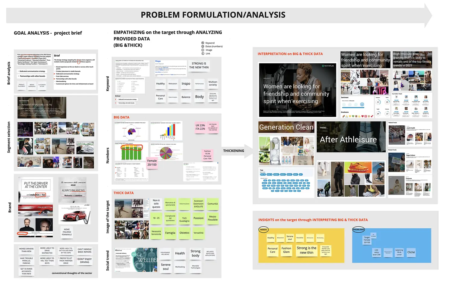 This way of studying and understanding a design problem leads designers to collect at least 15 different types of qualitative data ranging from user observations to direct interviews, information provided by the client, and their own personal experience. Such data, which seeks a deep understanding of people, behaviours, contexts and histories, is referred to inethnography as Thick Data, which describes people backgrounds and cannot be quantified; for creatives, this type of information is the main source of inspiration.
