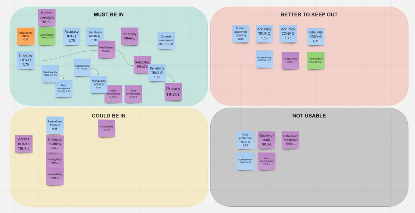 Moving from the questionnaire results, we built long lists of qualities that users attach to AI-infused products, organised according to eight main dimensions. Through a structured confrontation with the literature and within the group of researchers, we hypothesised a shortlist including those aspects we think users care about the most in AI-infused systems. They include transparency in showing which data are collected, how they are used, the reliability of the system, and its accuracy and usefulness. We also included qualities such as the system’s customizability and adaptability and, naturally, the capacity to listen to the user and provide answers using the voice.