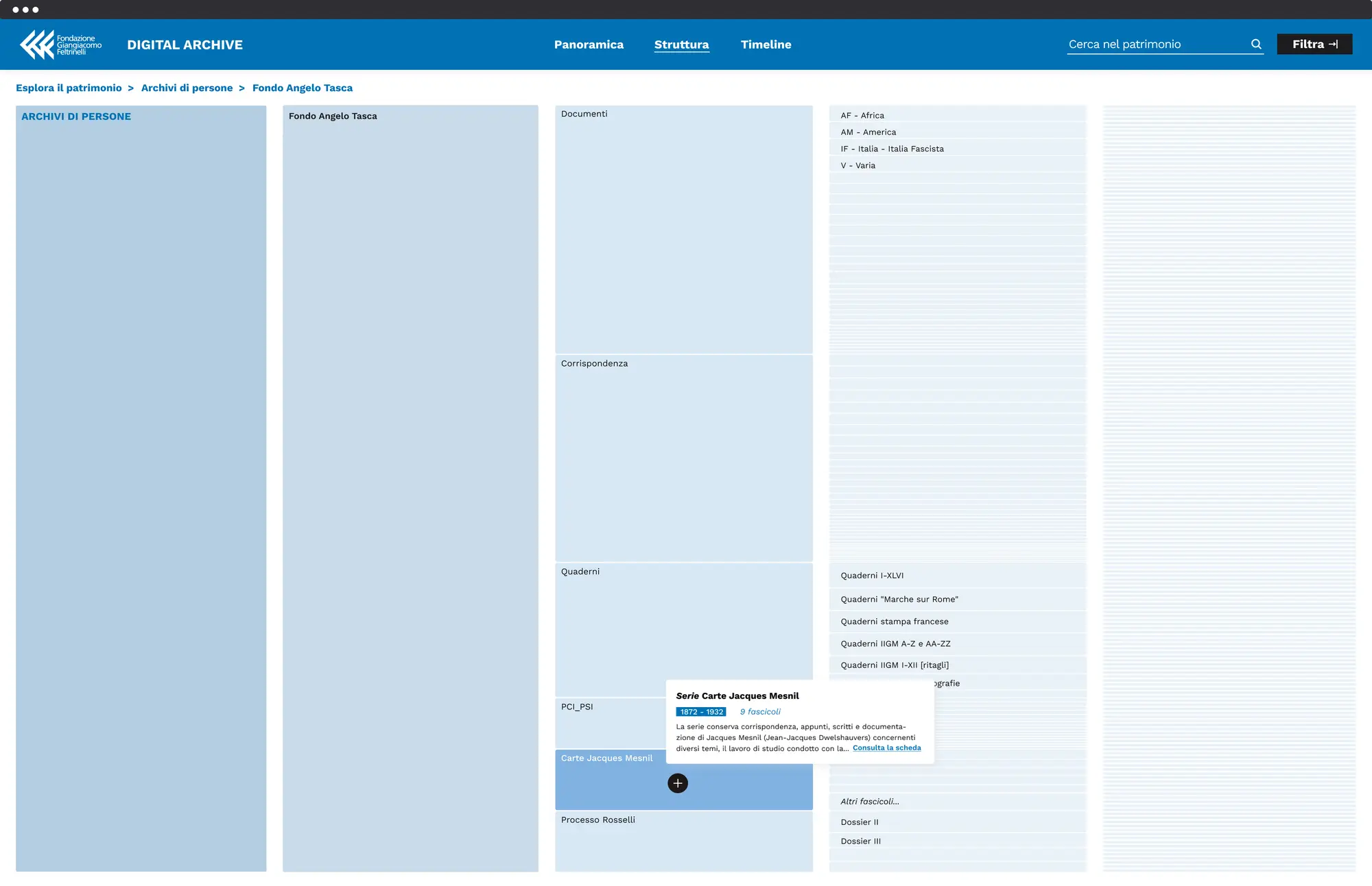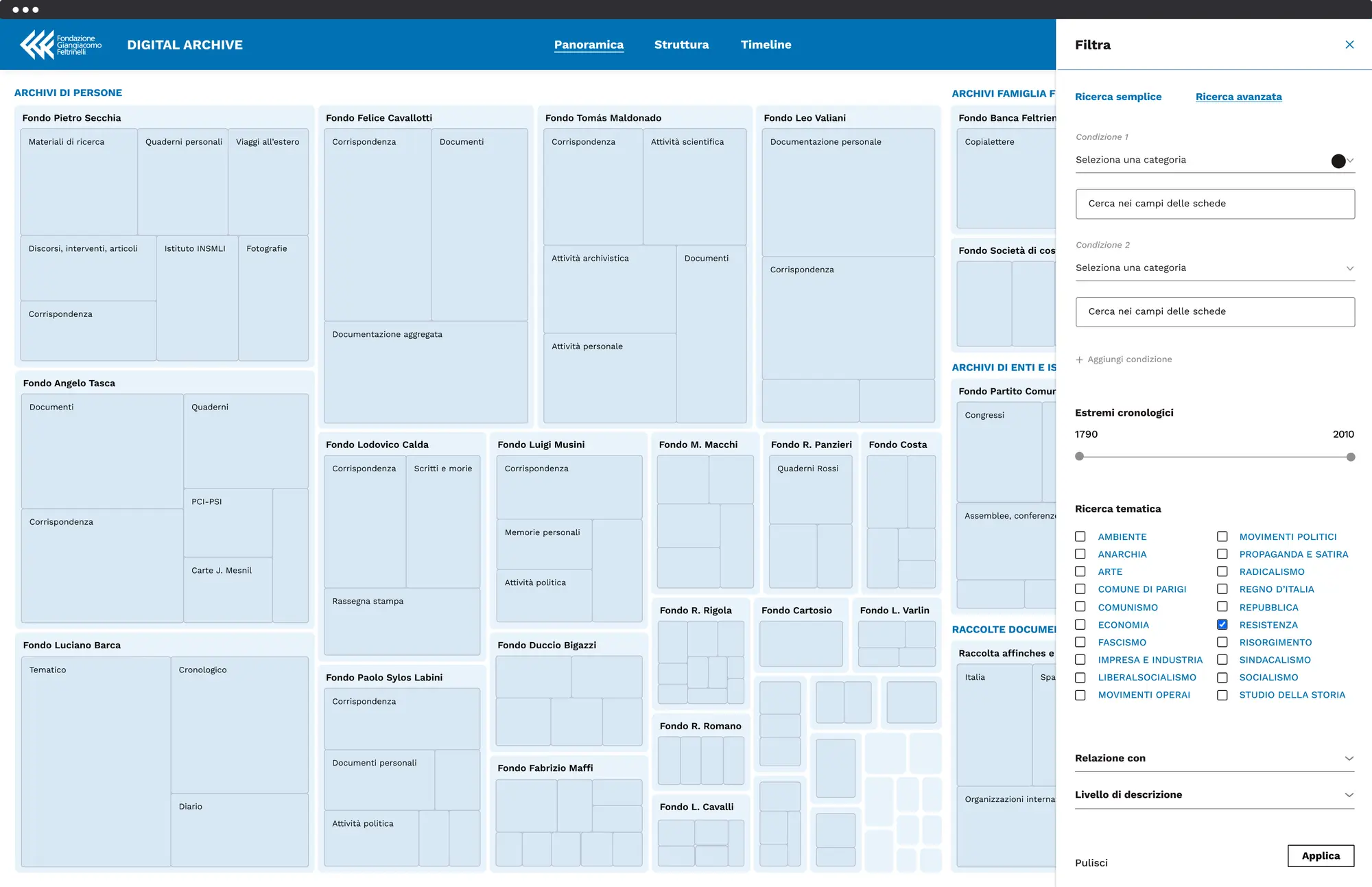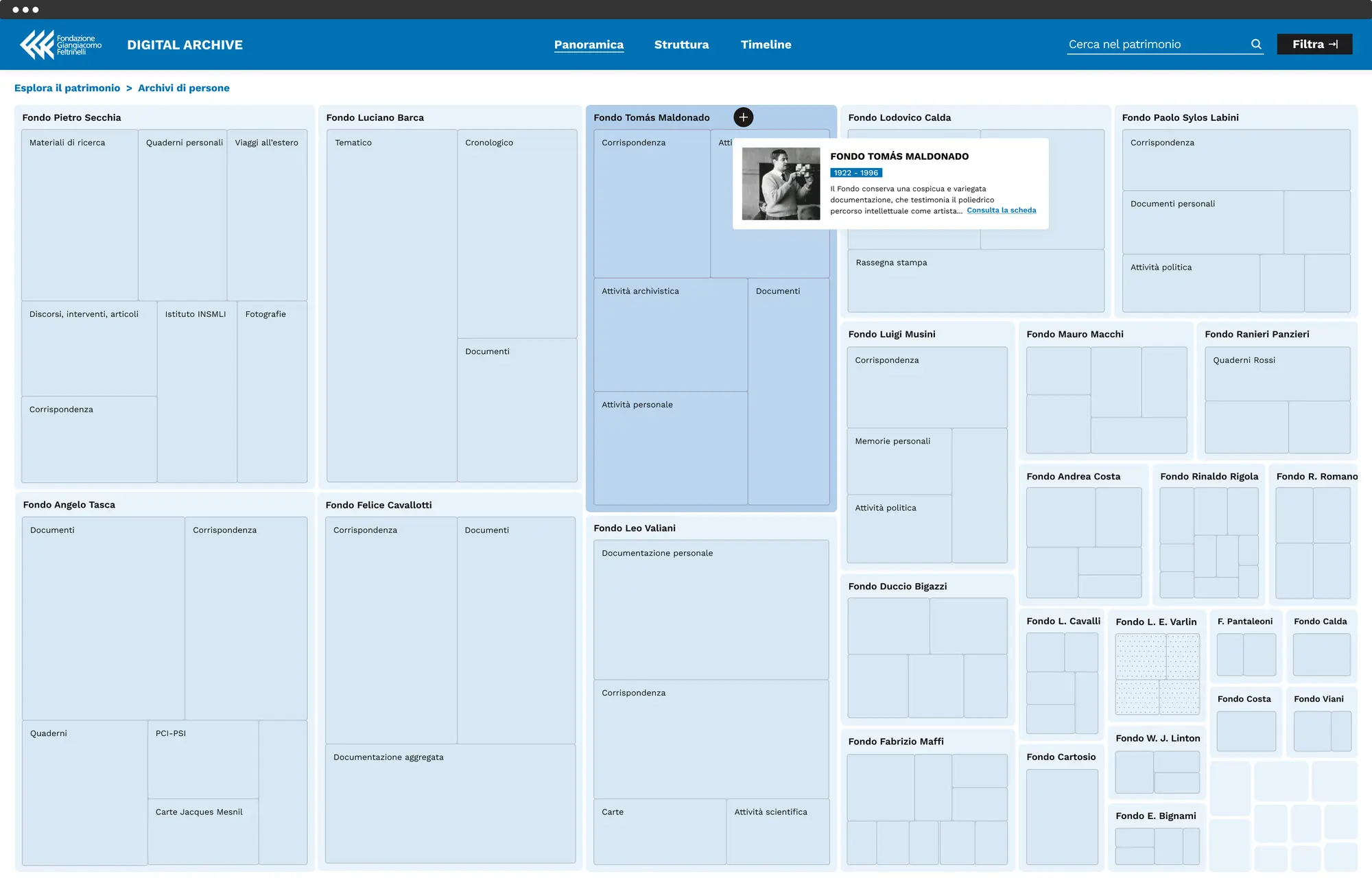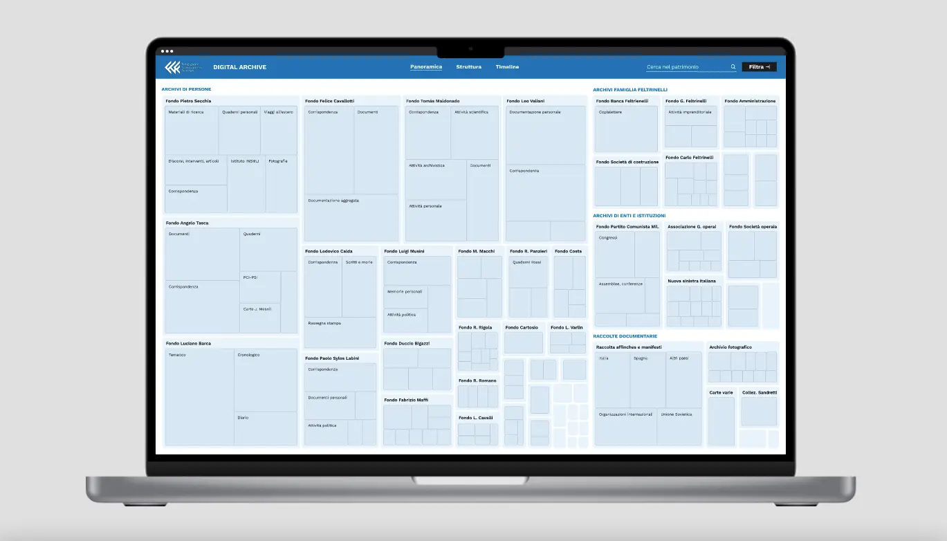 The project Maps of the system of archives of Fondazione Giangiacomo Feltrinelli aims to propose a communication system for the exploration and consultation of archival materials within large-scale archival systems, characterized by heterogeneity in the levels of content description. Research activities have led to the design of a digital platform capable of providing exploration tools suited to the rich and diverse contents of the Fondazione Giangiacomo Feltrinelli archives.