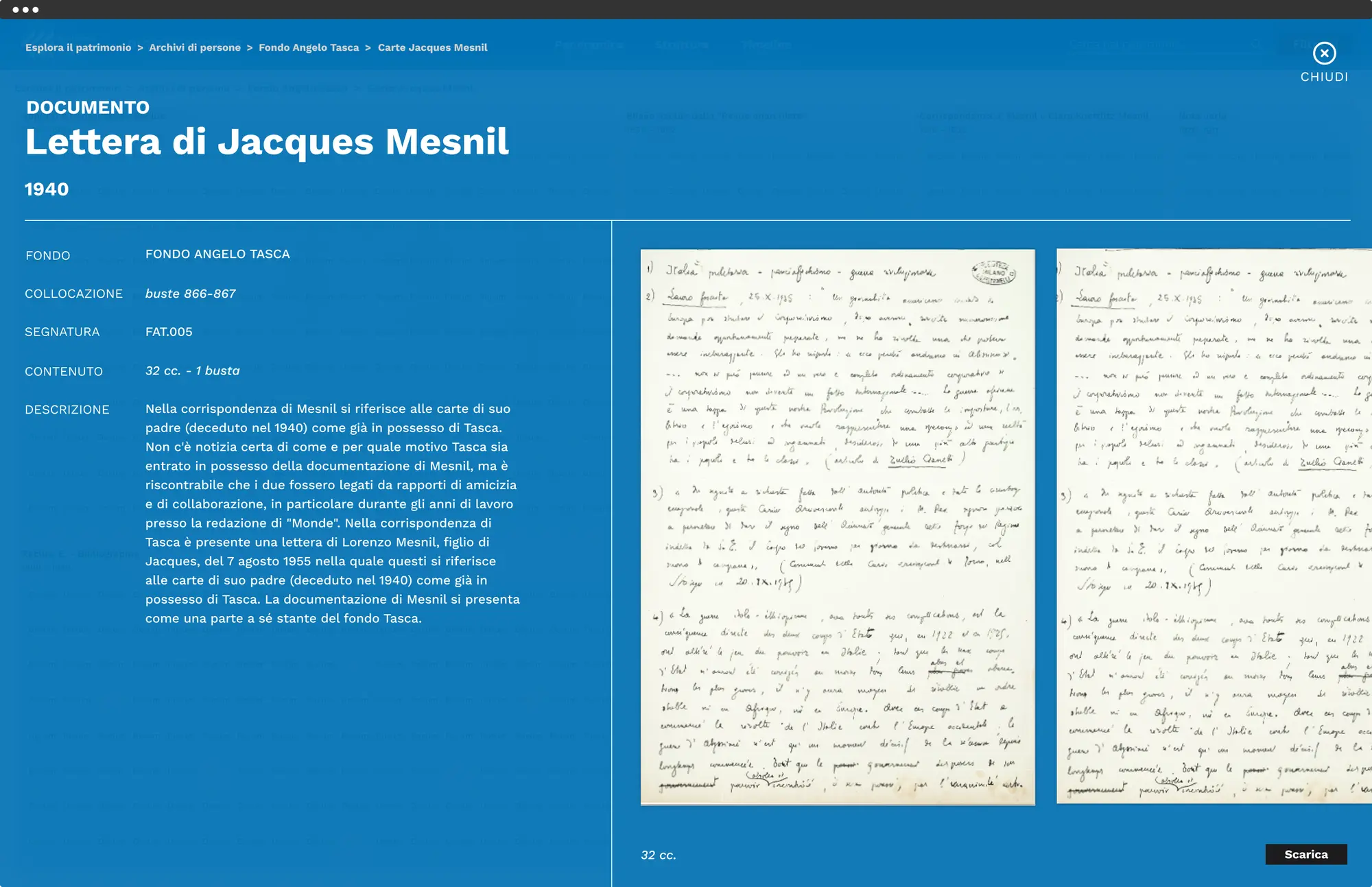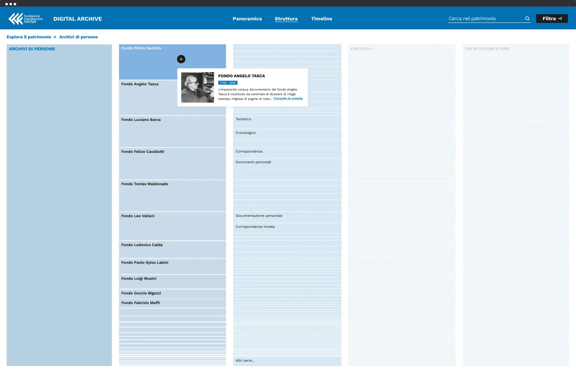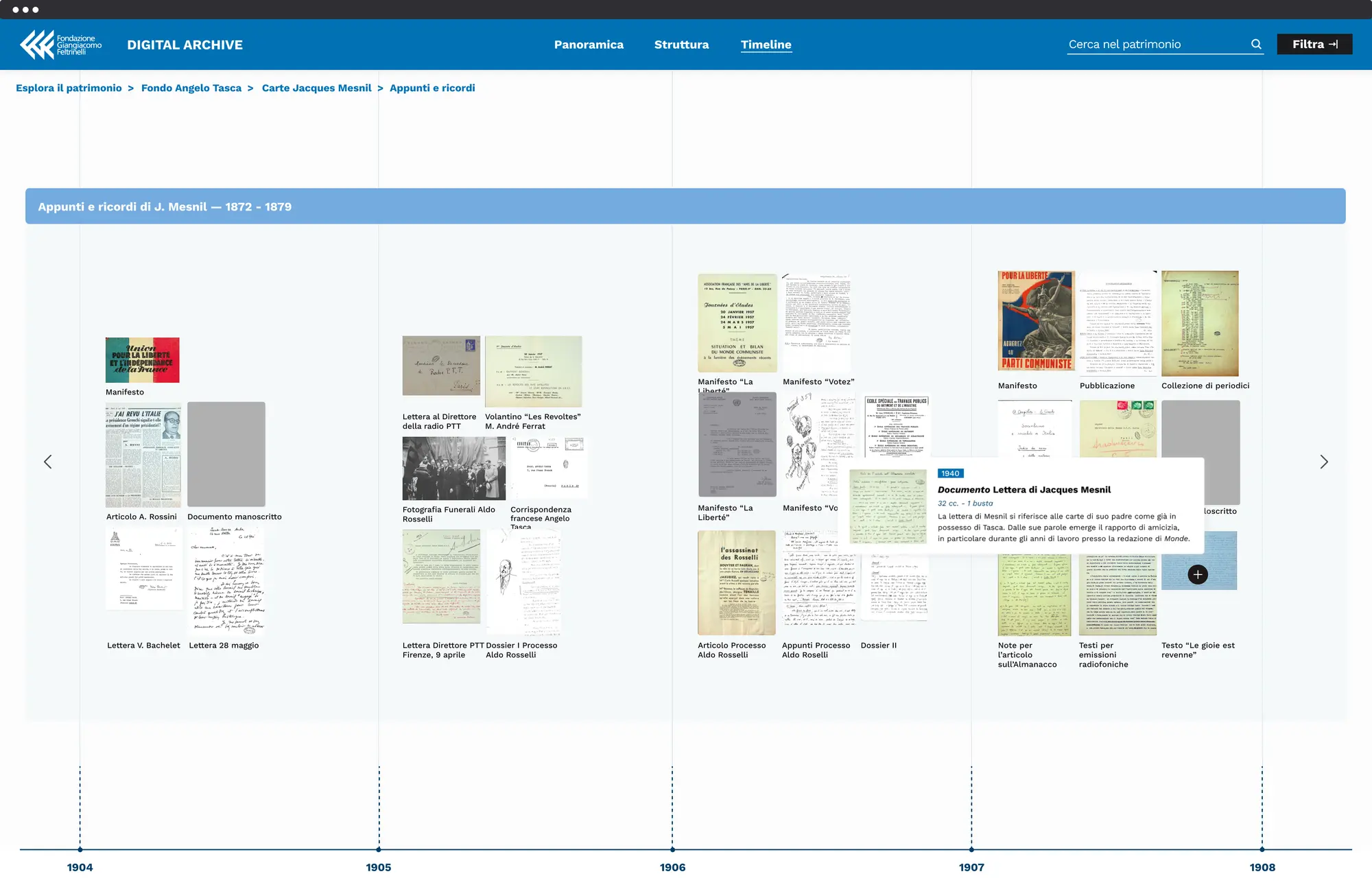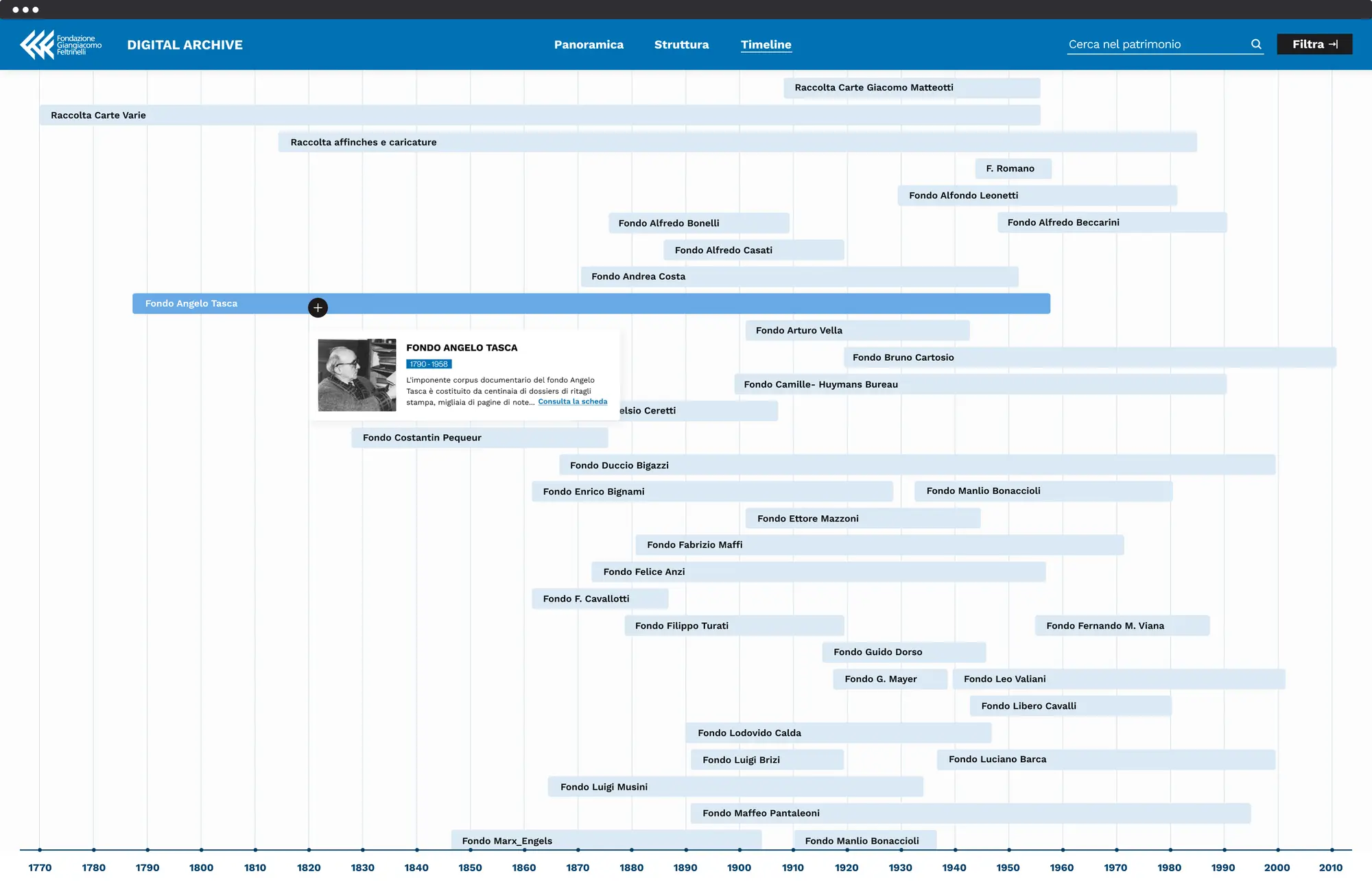 The project Maps of the system of archives of Fondazione Giangiacomo Feltrinelli aims to propose a communication system for the exploration and consultation of archival materials within large-scale archival systems, characterized by heterogeneity in the levels of content description. Research activities have led to the design of a digital platform capable of providing exploration tools suited to the rich and diverse contents of the Fondazione Giangiacomo Feltrinelli archives.