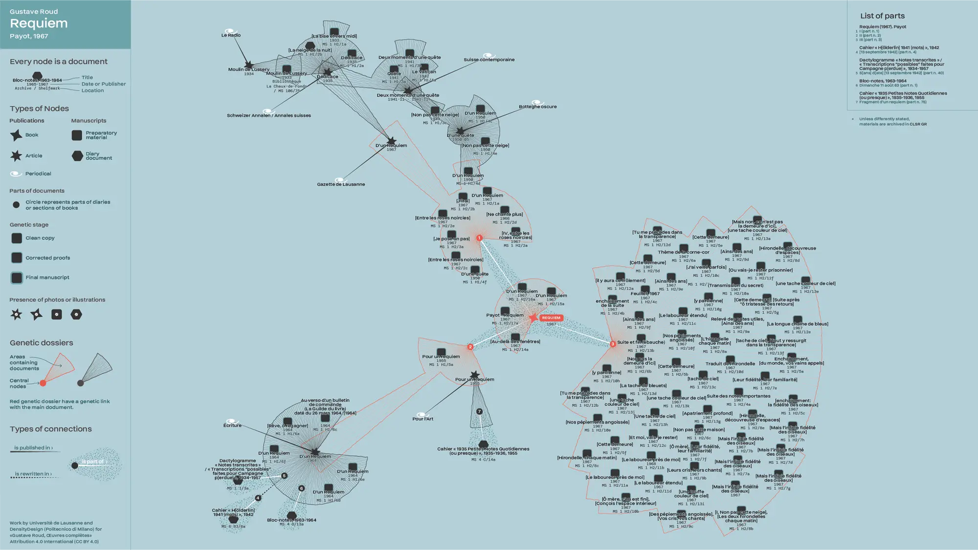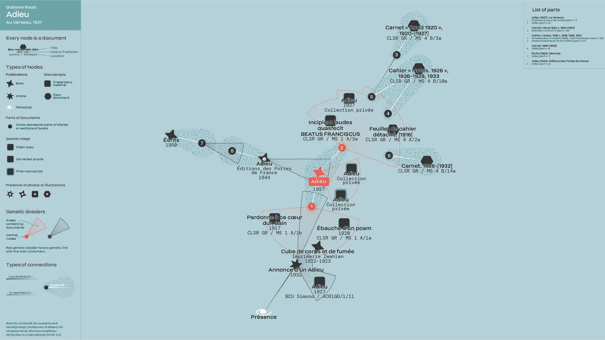 This research adds to the body of works that attempt at visually representing genetic studies on literature. The project provides a visual representation of the creative process followed by Gustave Roud in the making of some of his most famous literary works. The project refers to these visualizations with the phrase “genetic networks”, because they support scholars in inquiring the genesis of literary works. This work is part of the bigger initiative entitled Gustave Roud, «Œuvres complètes», funded by the FNS.