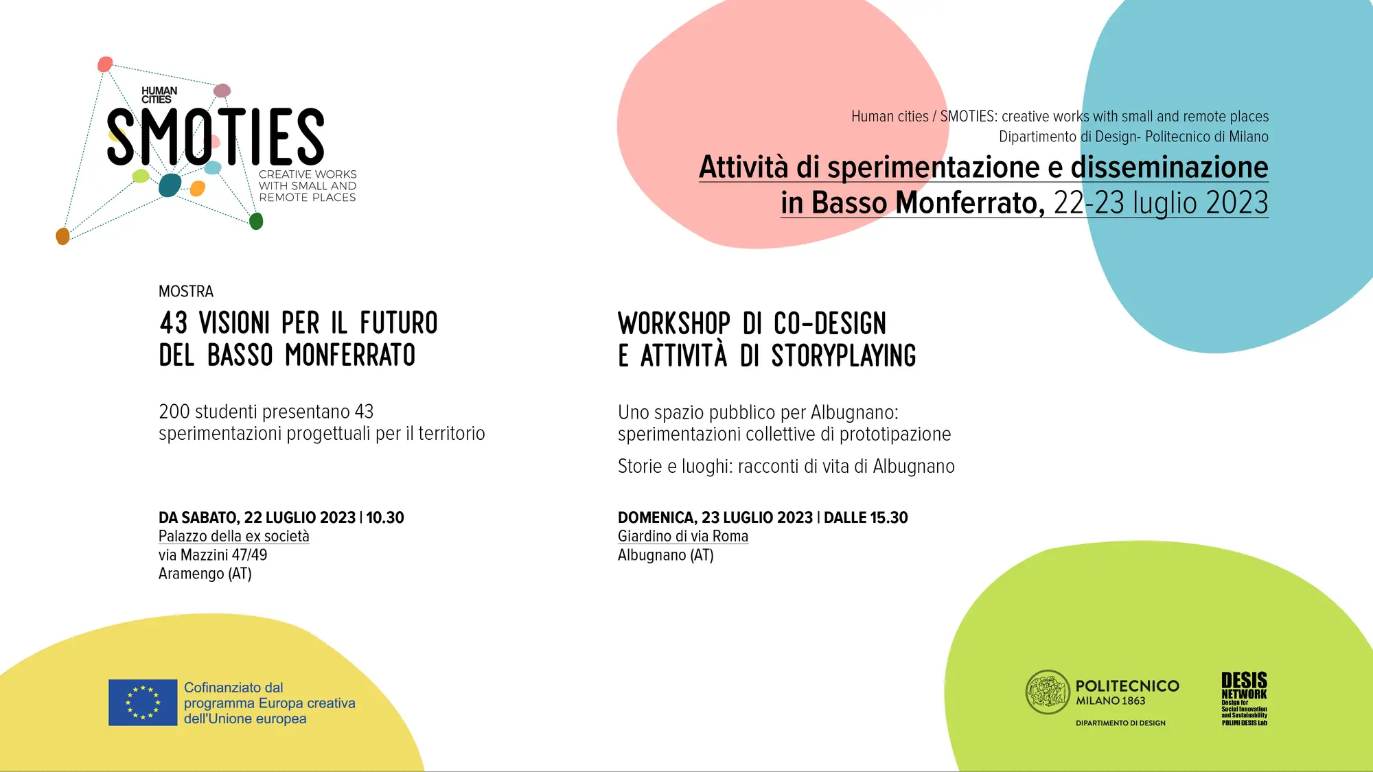 Il Dipartimento di Design del Politecnico di Milano organizza due giornate di attività di sperimentazione e disseminazione in Basso Monferrato per il progetto di ricerca "Human Cities / SMOTIES: creative works with small and remote places.