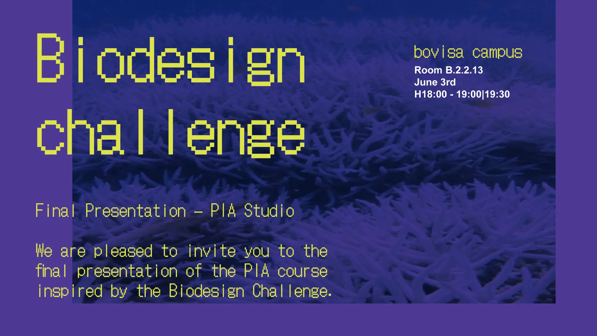Ciascun gruppo presenterà il proprio lavoro in un'unica sessione coesa, mostrando il proprio processo, la ricerca e i prototipi. Al termine delle presentazioni, verrà annunciato il gruppo vincitore, che concorrerà poi per il Biodesign Challenge Digital Submission Prize.