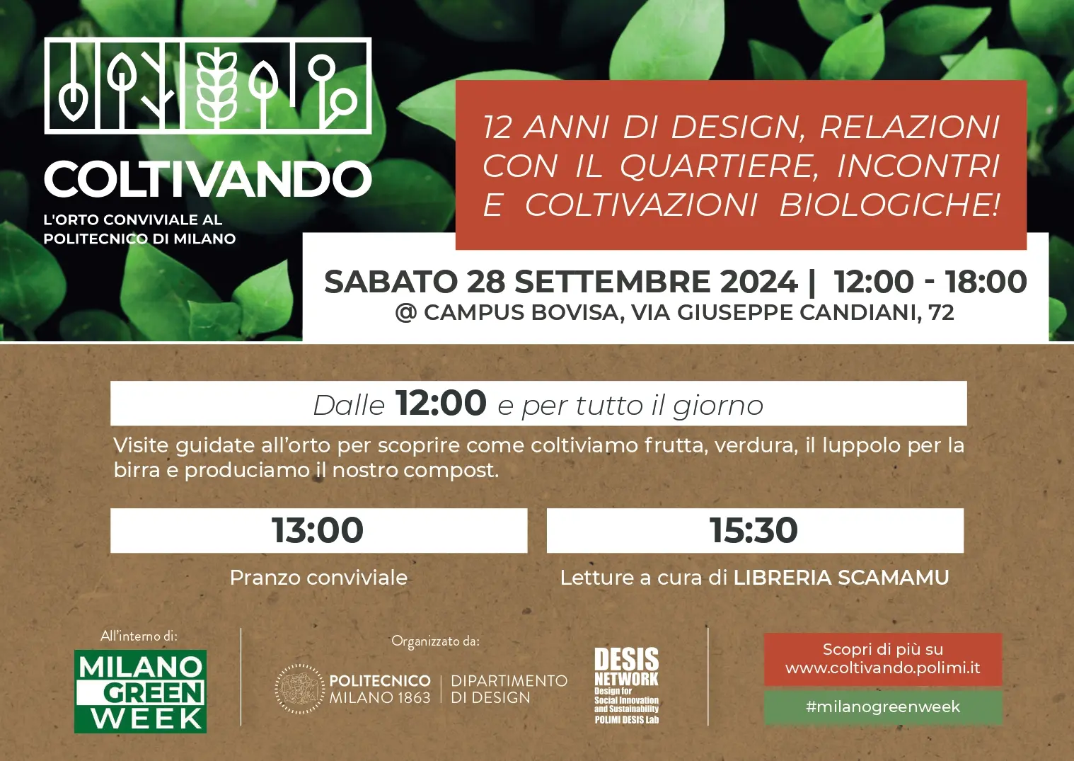 In occasione della Milano Green Week 2024, POLIMI DESIS Lab presenta l'evento “12 anni di design, relazioni con il quartiere, incontri e coltivazioni biologiche!”, un' iniziativa legata a Coltivando, il progetto di coltivazione collettiva del Politecnico di Milano.