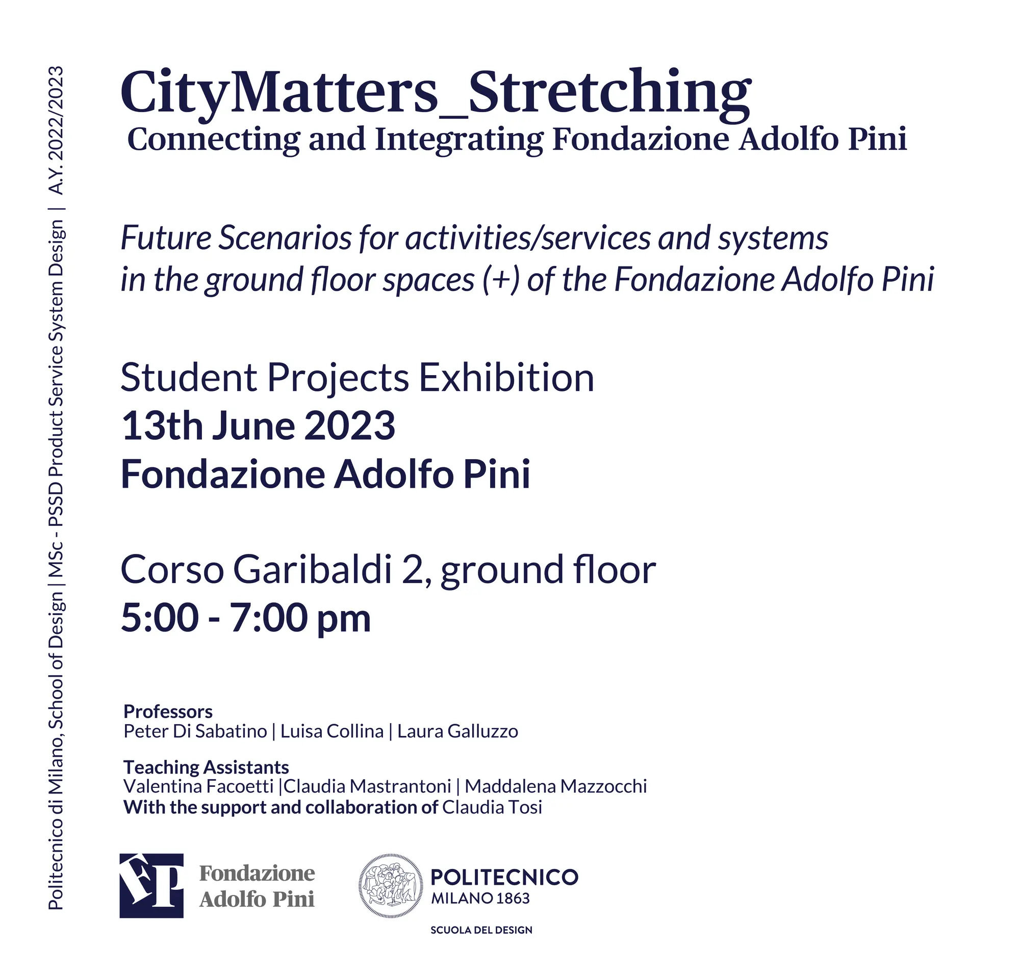 Gli studenti e i docenti del corso di Laurea Magistrale Product Service System Design (PSSD), del Politecnico di Milano - Scuola del Design, hanno il piacere di invitarvi alla mostra dei risultati del corso “CityMatters_Stretching | Connecting and Integrating Fondazione Adolfo Pini”, 2023.