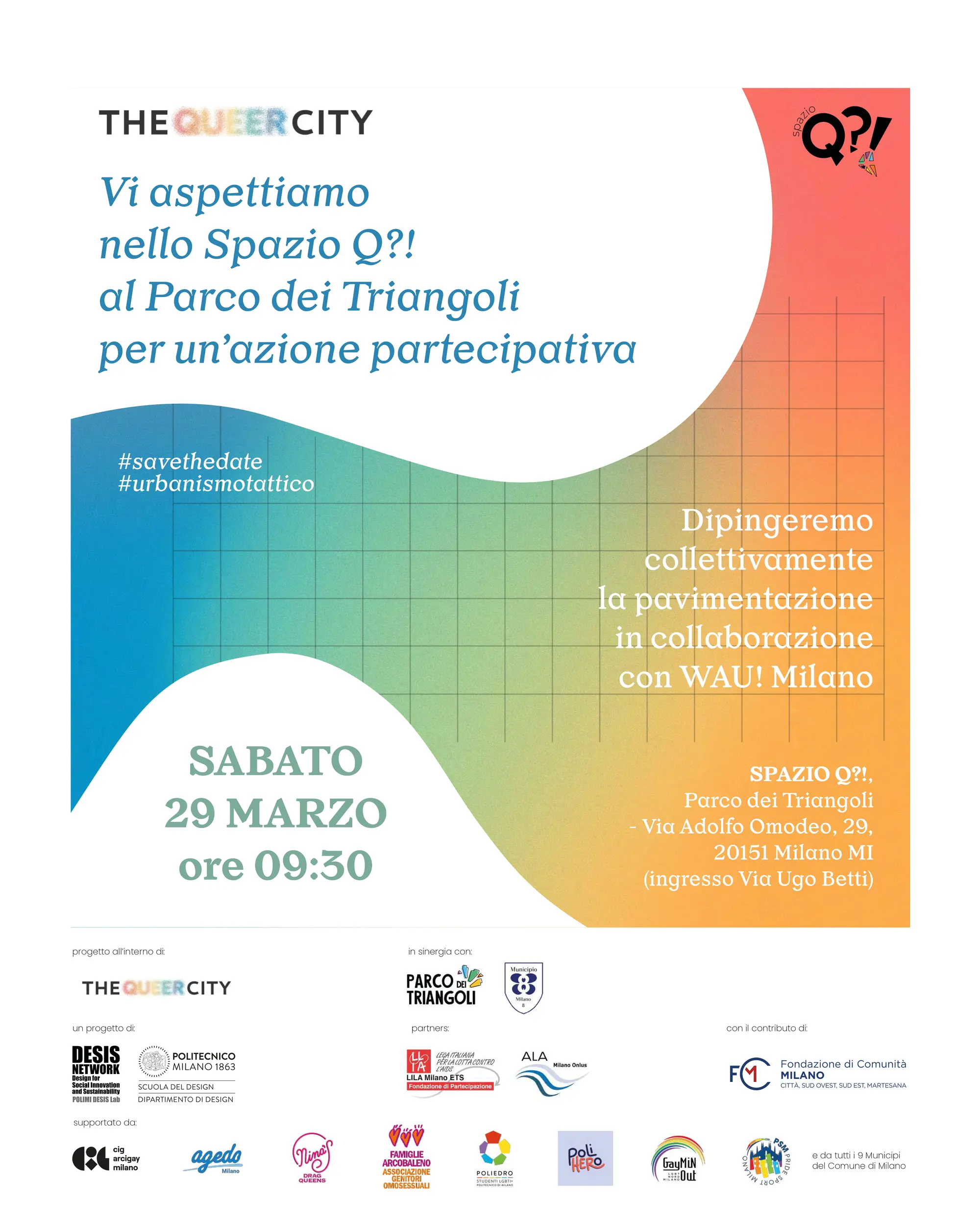 SPAZIO Q?! è un nuovo spazio pubblico di convivialità, socialità e di espressione all’interno del Parco dei Triangoli, nel Gallaratese, realizzato all’interno di THE QUEER CITY, progetto del Polimi DESIS Lab del Dipartimento di Design del Politecnico di Milano, sviluppato in partnership con ALA Milano Onlus e Fondazione LILA Milano ETS, grazie al contributo di Fondazione di Comunità Milano, con il supporto di una rete composta dai 9 Municipi del Comune di Milano e da 8 associazioni LGBTQIA+ (Agedo, CIG Arcigay Milano, Famiglie Arcobaleno, GayMiN Out, Nina’s Drag Queens – Aparte, PoliHERo, Poliedro, Pride Sport Milano).