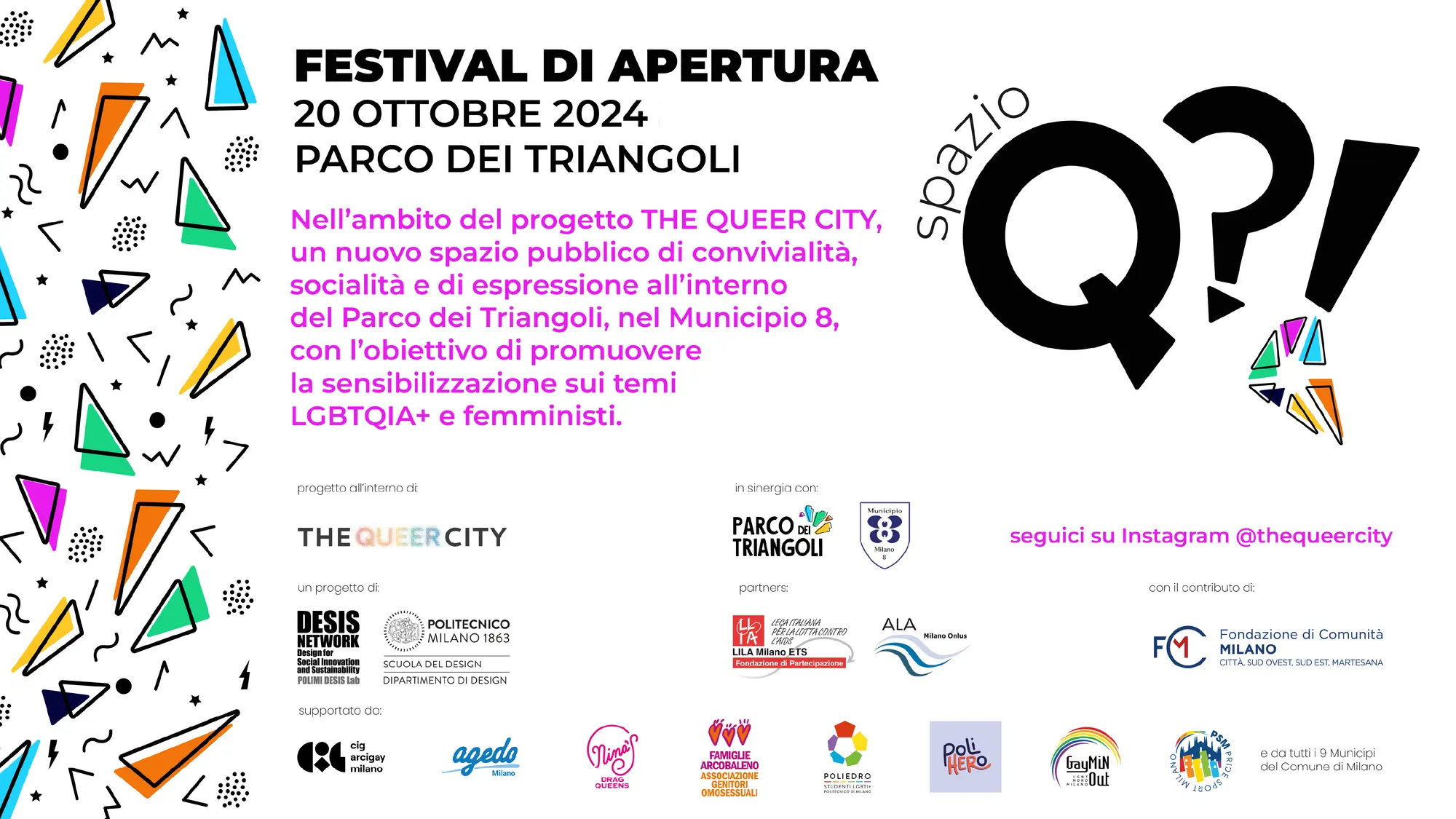 SPAZIO Q?! è un nuovo spazio pubblico di convivialità, socialità e di espressione all’interno del Parco dei Triangoli, nel Gallaratese, realizzato all’interno di THE QUEER CITY, progetto del Polimi DESIS Lab del Dipartimento di Design del Politecnico di Milano, sviluppato in partnership con ALA Milano Onlus e Fondazione LILA Milano ETS, grazie al contributo di Fondazione di Comunità Milano, con il supporto di una rete composta dai 9 Municipi del Comune di Milano e da 8 associazioni LGBTQIA+ (Agedo, CIG Arcigay Milano, Famiglie Arcobaleno, GayMiN Out, Nina’s Drag Queens – Aparte, PoliHERo, Poliedro, Pride Sport Milano).