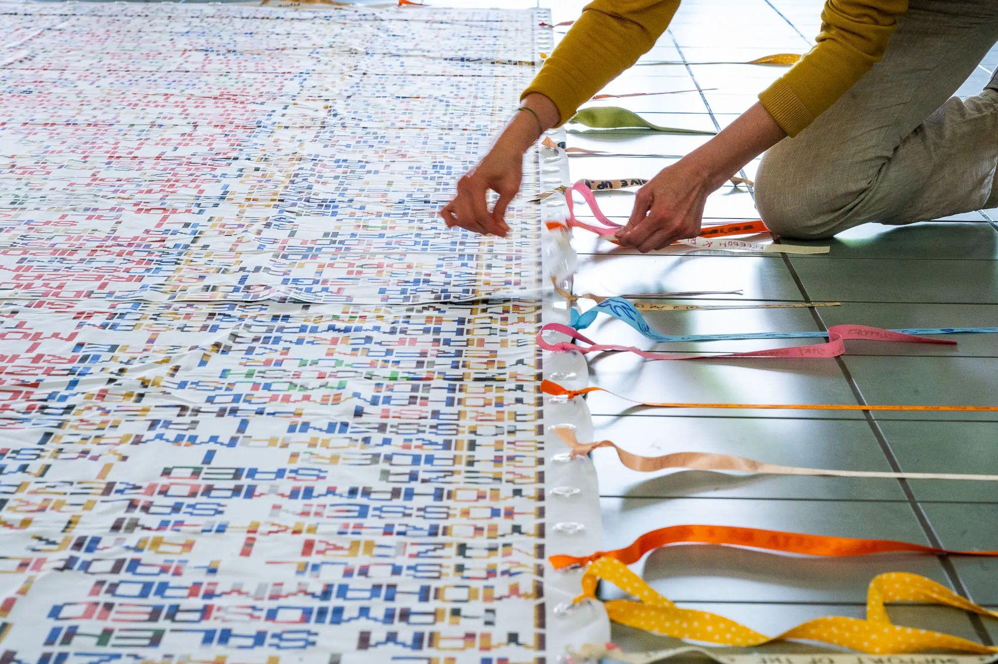 Durante la Performance i visitatori hanno potuto annodare i loro messaggi alle molte asole poste ai bordi del grande tappeto per testimoniare solidarietà alla richiesta di libertà delle donne iraniane.