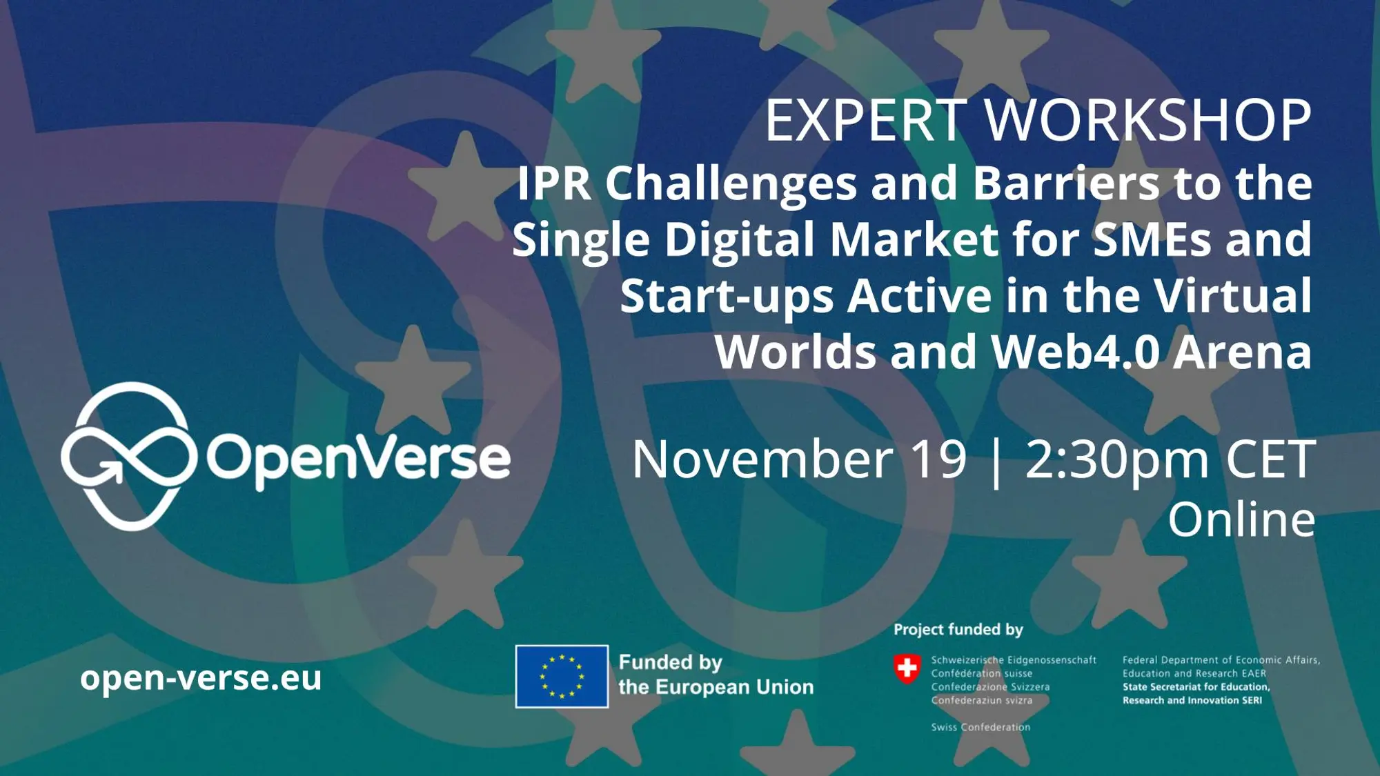 Domani, 19 novembre, alle 14:30 CET, OPENVERSE ospiterà un Expert Workshop online incentrato su “IPR Challenges and Barriers to the Single Digital Market for SMEs and Start-ups Active in the Virtual Worlds and Web4.0 Arena”.