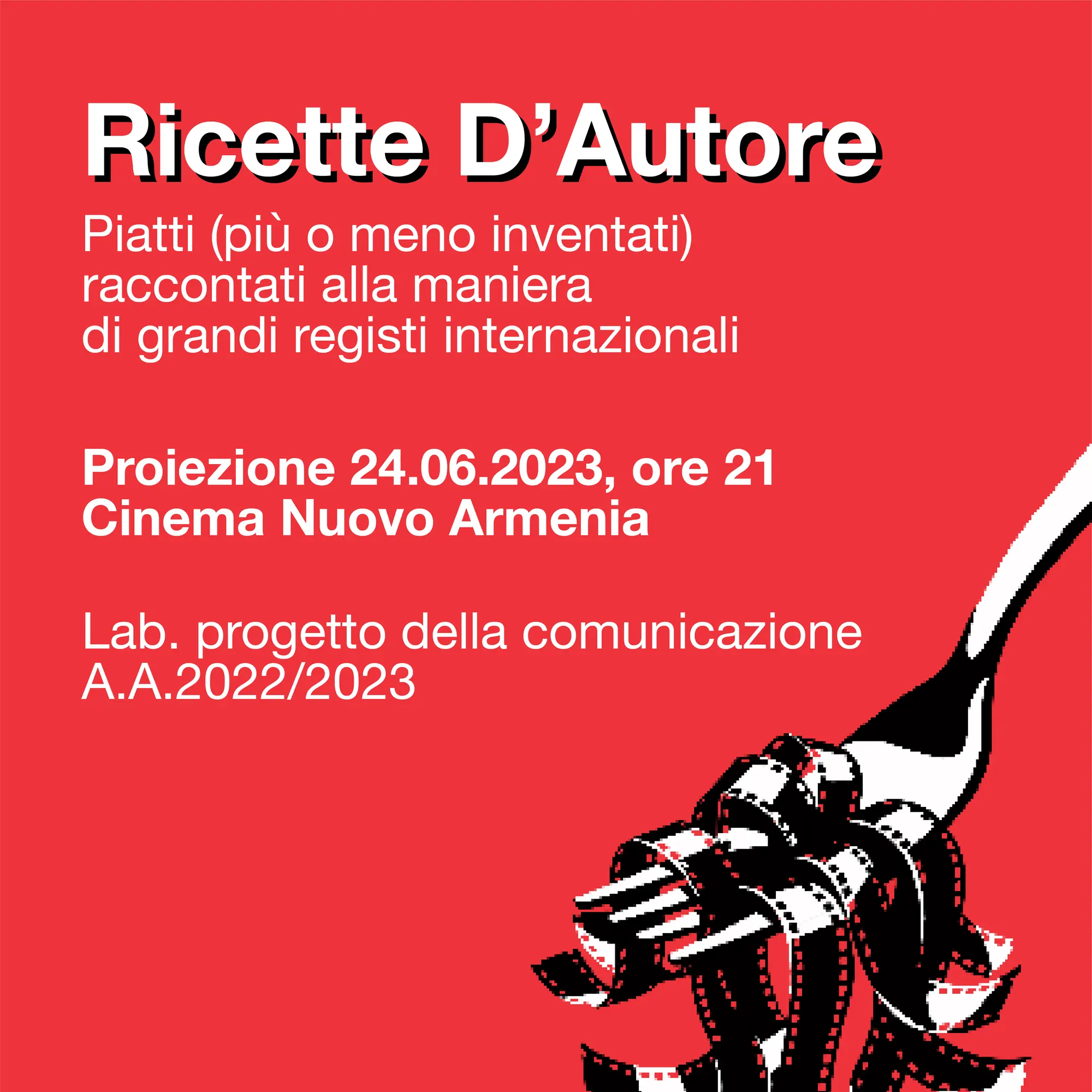 60 giovani designer del Politecnico di Milano, organizzati in 8 team, hanno analizzato l'opera di 8 grandi autori del cinema internazionale. Ogni gruppo ha interpretato la poetica ed i codici di rappresentazione dell’autore scelto, facendosi ispirare per l’ideazione di un proprio progetto audiovisivo. Sono giunti così alla produzione di brevi video, tutti accomunati dalla rappresentazione di una ricetta gastronomica, ma sviluppando differenti chiavi di lettura e forme di narrazione.