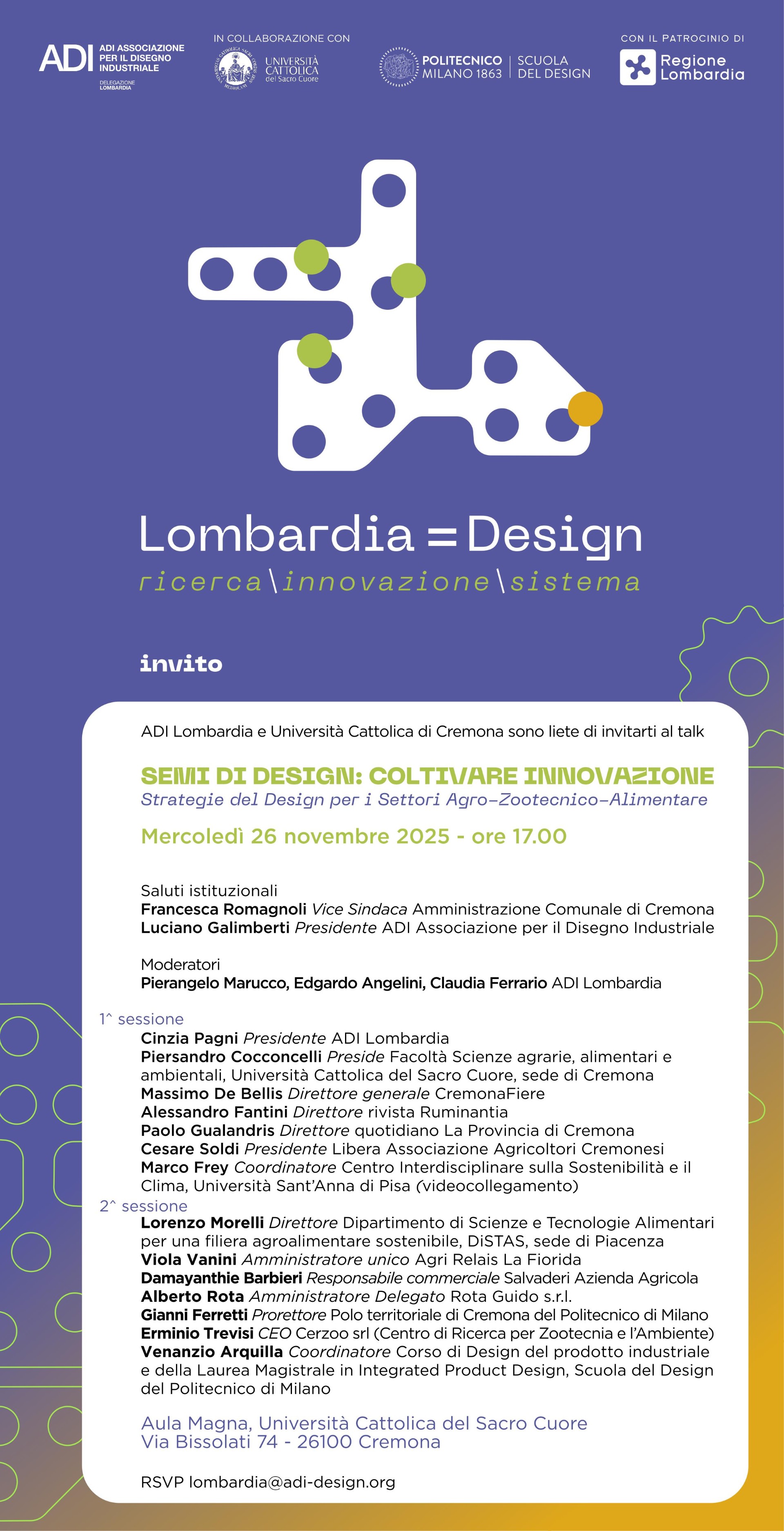 Il quarto appuntamento del ciclo "Lombardia = Design" arriva a Cremona con un talk dedicato al ruolo del design nei settori agro–zootecnico–alimentare. L’iniziativa è promossa da ADI Lombardia, in collaborazione con l’Università Cattolica di Cremona e con il patrocinio di Regione Lombardia.
