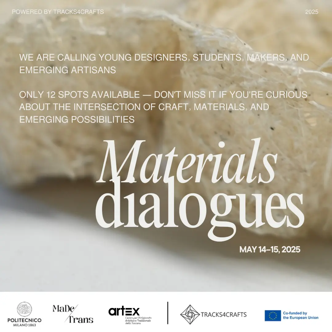 Nell'ambito del progetto europeo Tracks4Crafts, il gruppo di ricerca MaDe/Trans del Politecnico di Milano è lieto di invitare giovani designer, studenti, artigiani emergenti a un workshop pratico gratuito presso Artex - Centro per l'Artigianato Artistico e Tradizionale della Toscana.