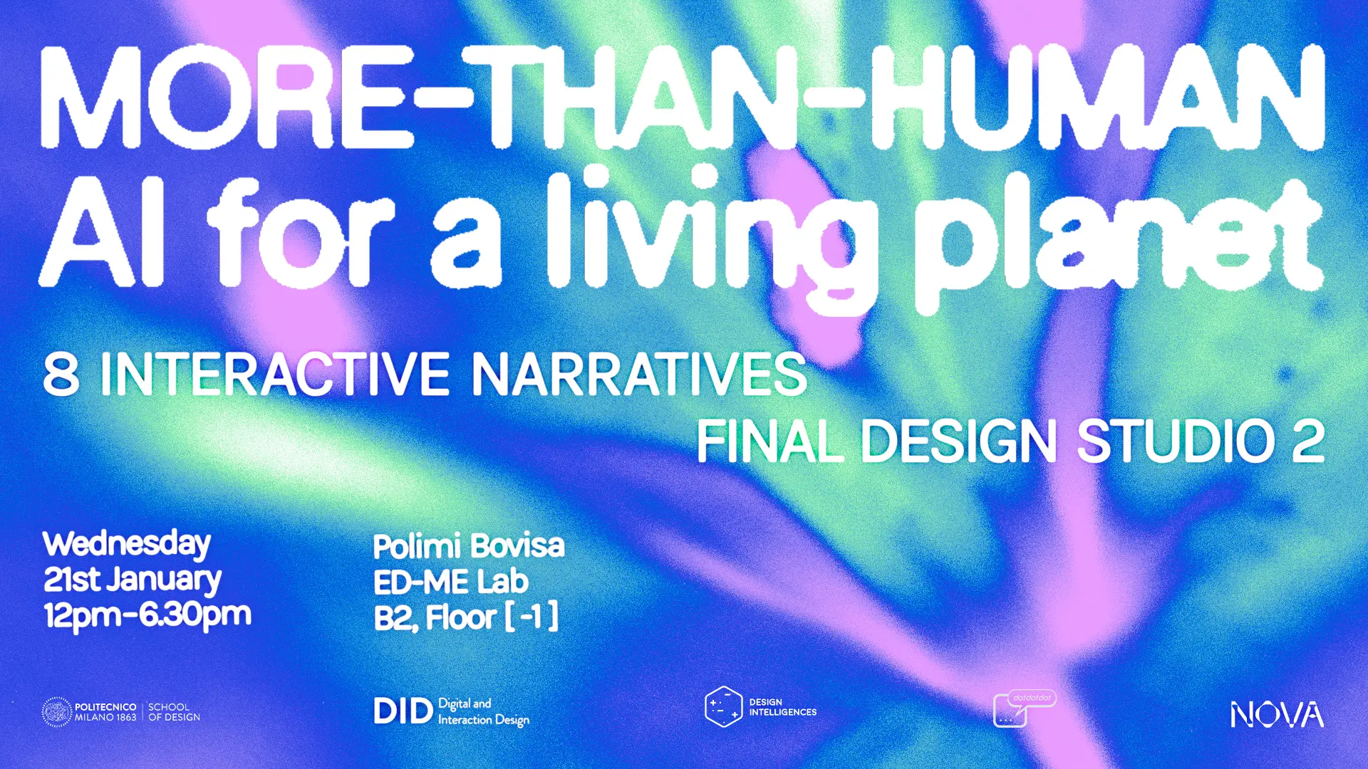 Da queste riflessioni nasce MORE-THAN-HUMAN: AI for a Living Planet, un’esposizione che presenta otto progetti realizzati dagli studenti del Final Design Studio 2 del corso di Laurea Magistrale in Digital and Interaction Design del Politecnico di Milano. Questa esplorazione è promossa dal Design Intelligences, il collettivo more-than-human guidato da Elisa Giaccardi e Francesco Vergani, in collaborazione con Alessandro Masserdotti (Dotdotdot) e Matteo Martignoni (NOVA).