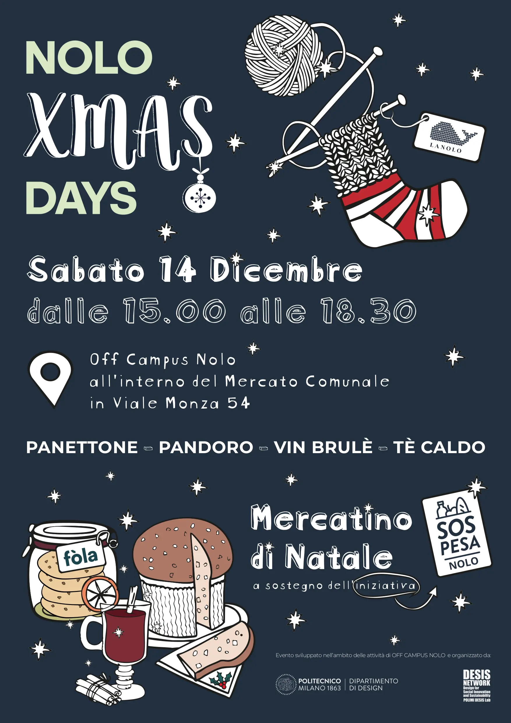 Sabato 14 dicembre, dalle 15 alle 18:30, Off Campus Nolo ospiterà la festa di Natale di “Sospesa Nolo”. Tra una fetta di pandoro e panettone, tè caldo e vin brulé, vi invitiamo presso il Mercato Comunale di Viale Monza, 54 dove vi accoglierà un mercatino con le creazioni di “Lanolo”, gruppo di quartiere che lavora la maglia, e di Fòla, pasticceria a pochi passi dal mercato.