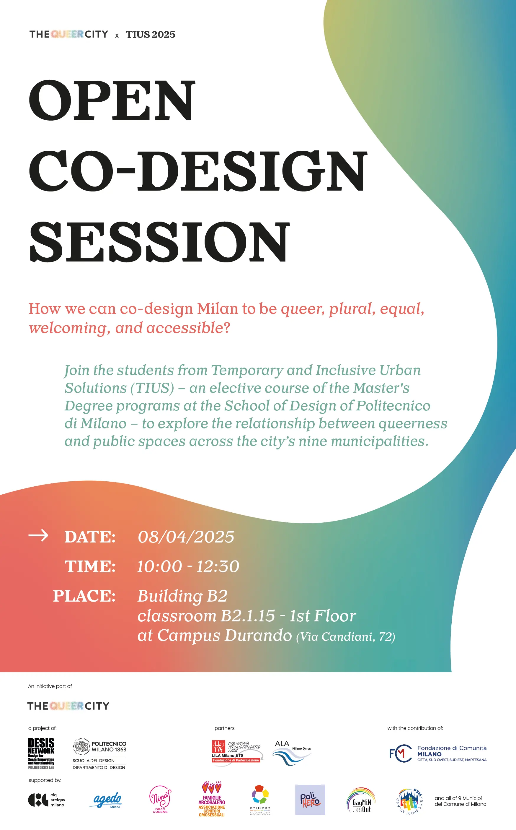 Vi invitiamo a partecipare all’evento “OPEN CO-DESIGN SESSION” organizzato dal corso a scelta per gli indirizzi di Laurea Magistrale della Scuola di Design del Politecnico di Milano “TIUS – Temporary and Inclusive Urban Solutions” – coordinato dalle prof.sse Laura Galluzzo e Elena Giunta con Ambra Borin e Silvia Peluzzi. Il corso rientra nel progetto The Queer City, finanziato dal Bando57 della Fondazione di Comunità.