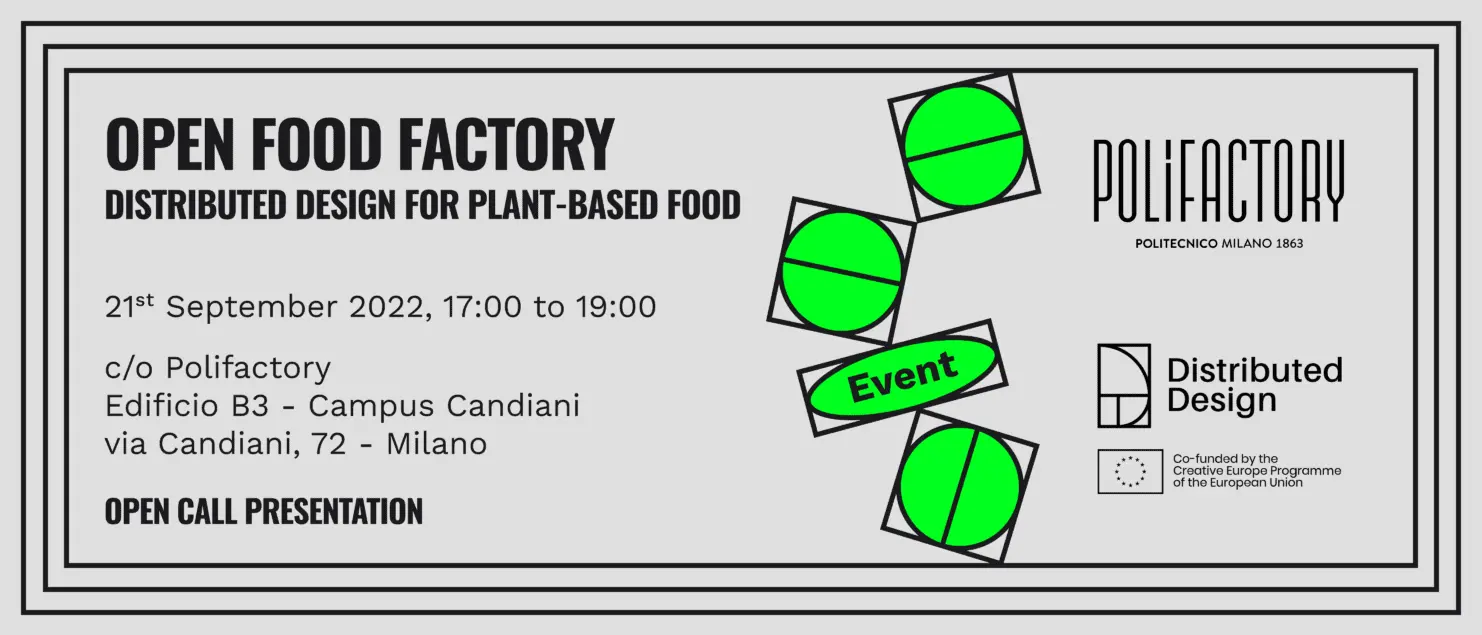 Polifactory è lieta di invitarvi a “Open Food Factory. Design distribuito per l’alimentazione a base vegetale”, che si terrà il 21 settembre 2022, dalle 17.00 alle 19.00, presso Polifactory (Edificio B3 – Campus Candiani, via Candiani, 72, Milano).