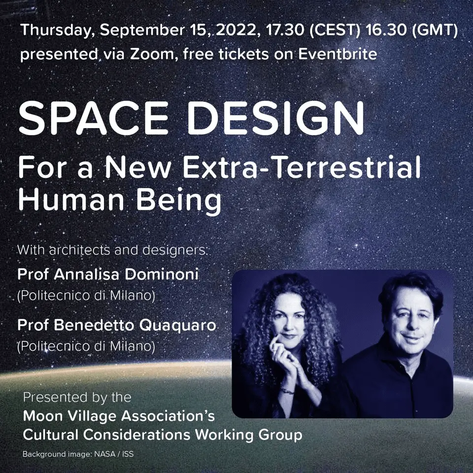 Vi invitiamo a partecipare al webinar "Space Design for a New Extra-Terrestrial Human Being" diretto dai professori Annalisa Dominoni e Benedetto Quaquaro, autori del corso Space4InspirAction della Scuola del Design, e presentato da Moon Village Association, che si terrà il prossimo giovedì 15 settembre 2022.