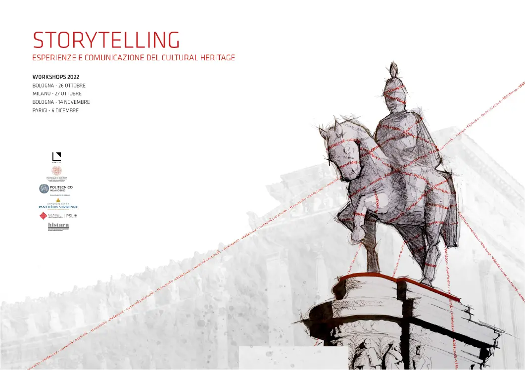 È con vero piacere che vi invitiamo a partecipare al workshop inter-universitario "Storytelling. Esperienze e comunicazione del Cultural Heritage", promosso dalla Professoressa Paola Cordera, che si terrà a Bologna (26 ottobre e 14 novembre), Milano (27 ottobre) e Parigi (6 dicembre).