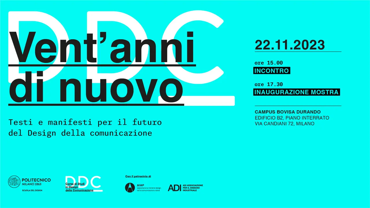 In seguito all’incontro verrà inaugurata la mostra "DDC Vent'anni di nuovo. Testi e manifesti per il futuro del Design della comunicazione" di manifesti progettati da grafici, designer della comunicazione, docenti e studenti che nel corso di questi anni hanno dato un contributo di rilievo allo sviluppo del Corso di Studi.