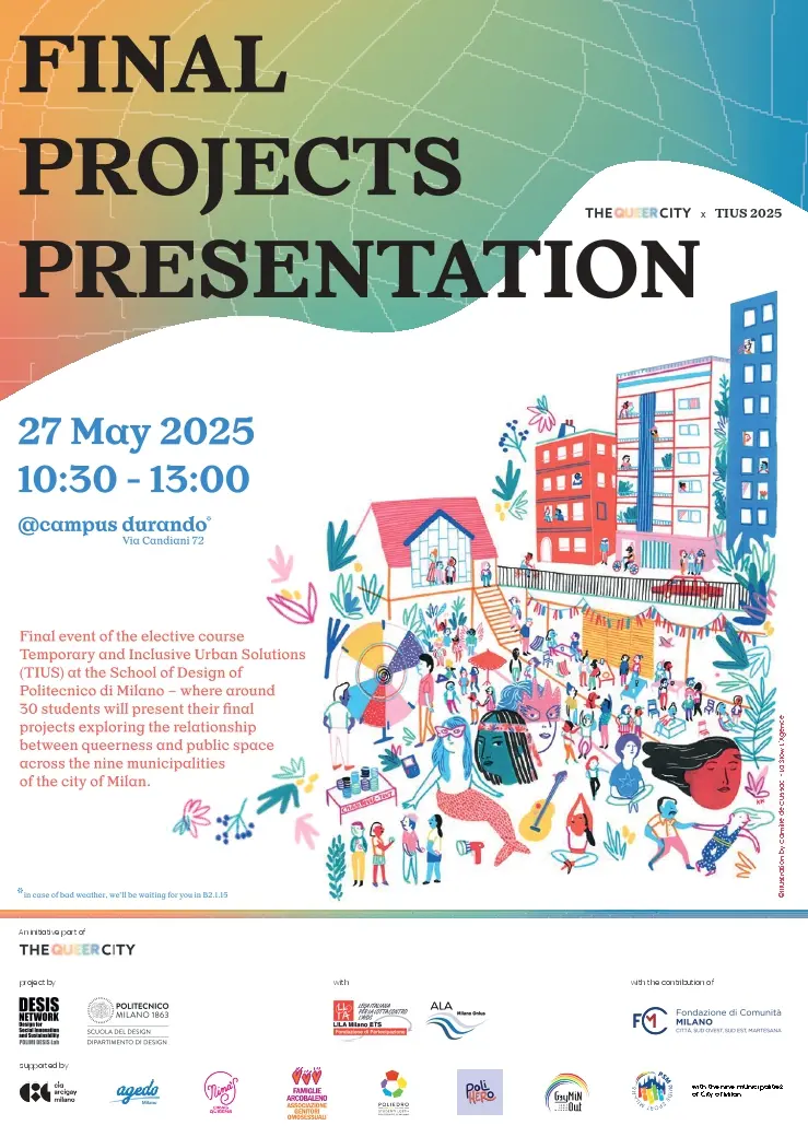 Martedì 27 maggio si terrà l’evento conclusivo organizzato dal corso a scelta per gli indirizzi di Laurea Magistrale della Scuola di Design del Politecnico di Milano “TIUS – Temporary and Inclusive Urban Solutions” – coordinato dalle prof.sse Laura Galluzzo e Elena Giunta con Ambra Borin e Silvia Peluzzi. Il corso rientra nel progetto The Queer City, finanziato dal Bando57 della Fondazione di Comunità. Circa trenta studentesse e studenti presenteranno i loro progetti finali sul rapporto tra queerness e spazio pubblico presso i nove municipi della città di Milano.
