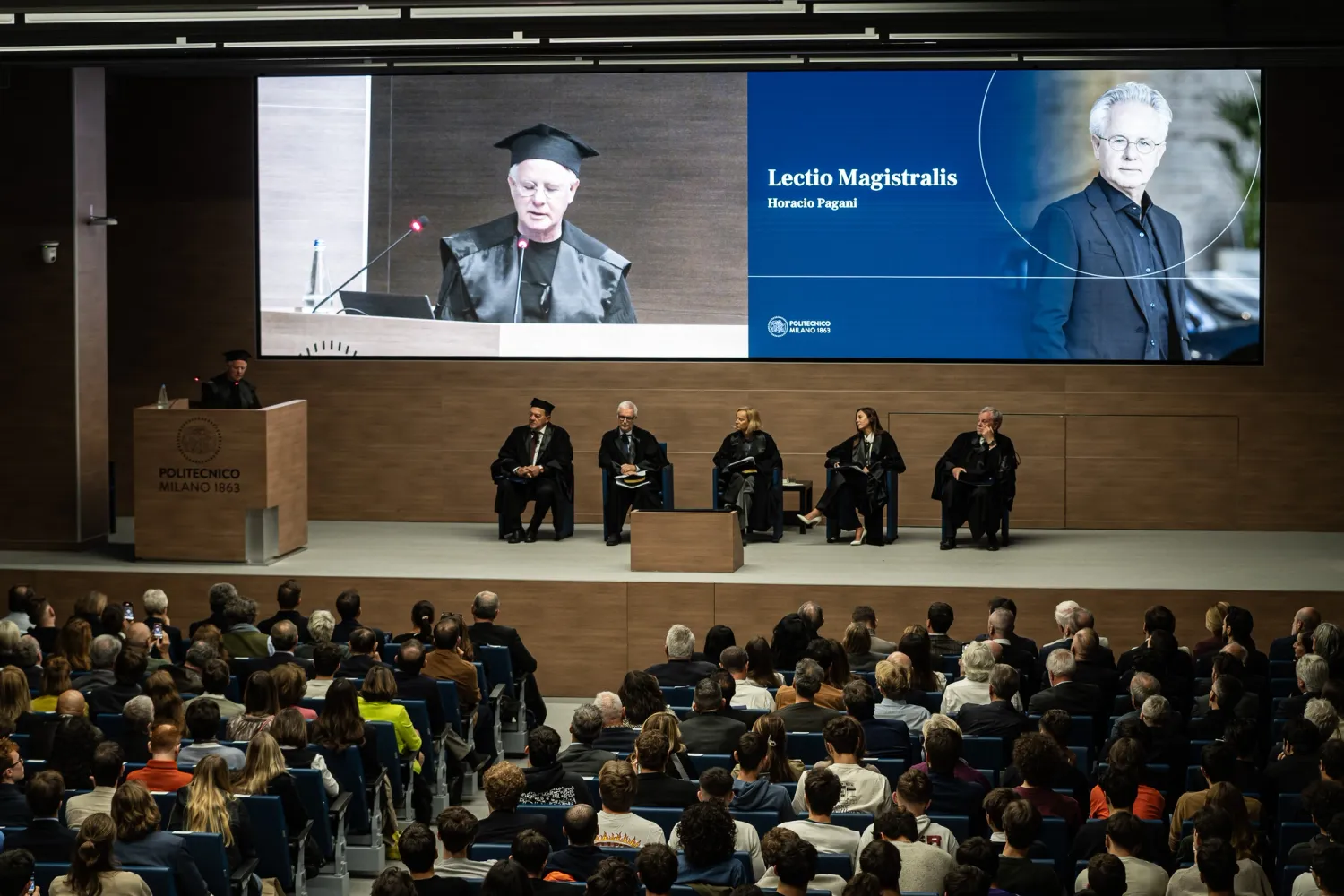 La motivazione della Laurea, letta dal professor Francesco Zurlo, Preside della Scuola del Design, ha sottolineato come l’opera di Pagani incarni in modo esemplare la sintesi tra arte, scienza e tecnologia: una visione in cui il design dialoga con l’ingegneria, restituendo automobili che sono al tempo stesso sistemi meccanici sofisticati e vere e proprie opere d’arte contemporanea.
